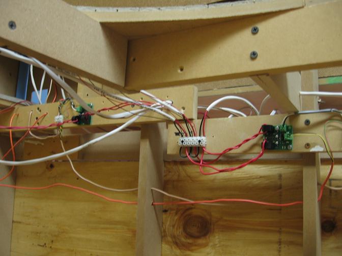 Here is the block detector of the main and siding under Bishop yard. The red and black wires are the track power wires, the brown wire is the 12 volt power wire, the orange wire is for both LED lights that runs to the dispatch panel.