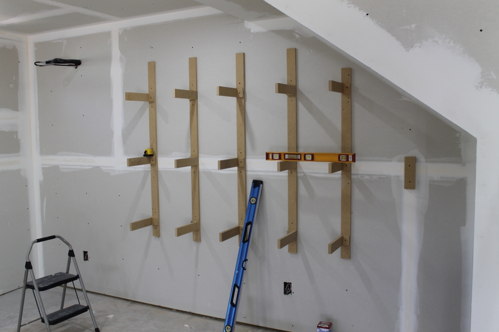 Now that the drywall is up and the room is cleaned out, the benchwork can begin! Just like my previous layouts, I'm building all my benchwork out of 3/4" MDF cut in to 2.5" wide strips. These strips are attached to the wall studs and supports are cantilevered out to form both levels of the railroad. The benchwork in the middle of the room will be built on traditional L girder with legs. The mushroom part of the layout will also have supports attached to the ceiling joists. At least that is the plan. Can't wait to start building the mushroom!