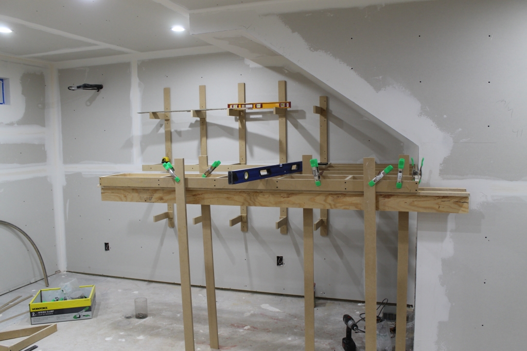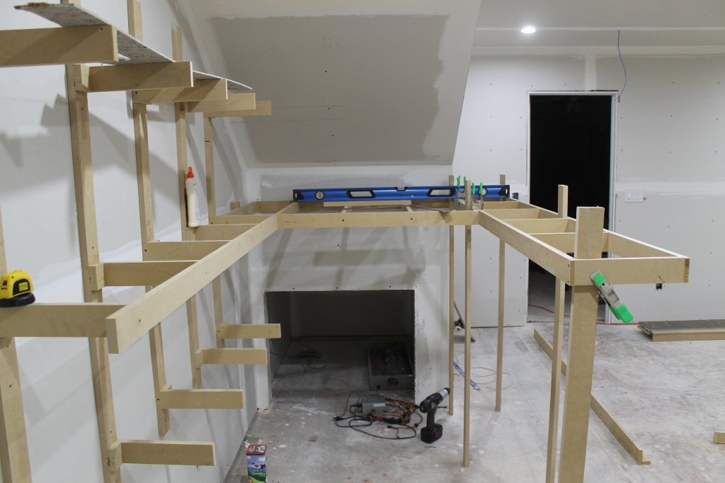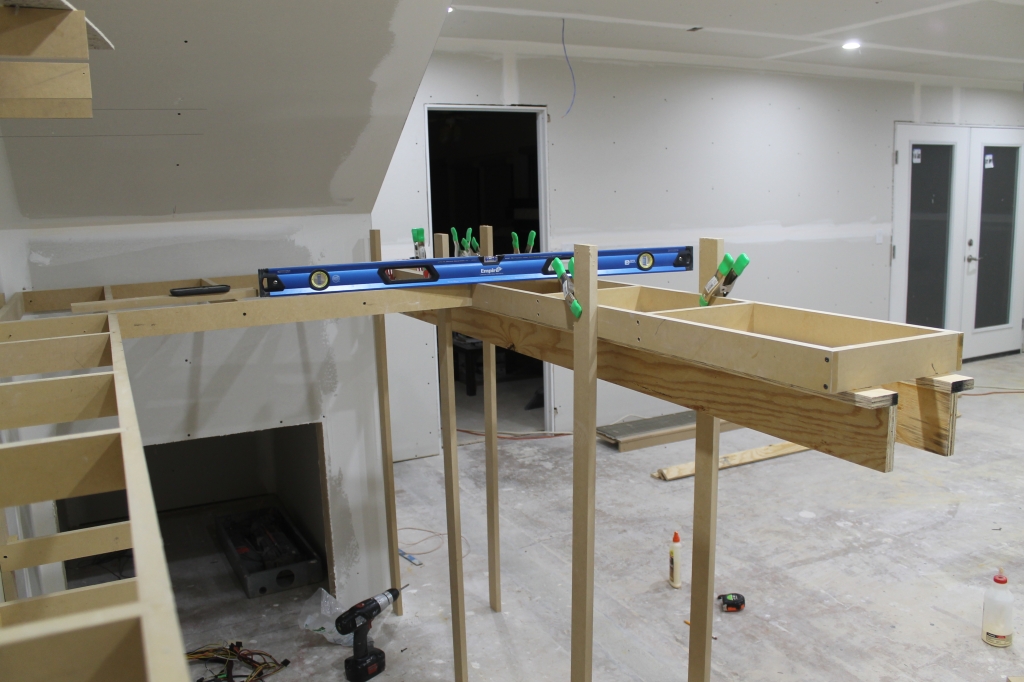 These are temporary legs holding this section up, haven't decided on what I'm going to use for permanent legs. Note the tubes sticking out of the wall, still waiting for the HVAC guys to come install the AC!