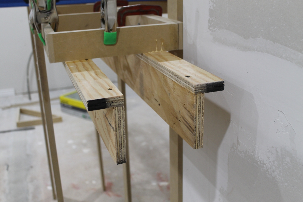 L girder supports added. I made these out of 3/4" plywood, since ply has better structural support than MDF over long runs with minimal support. Verticals are 4" and horizonals are 2.25"
