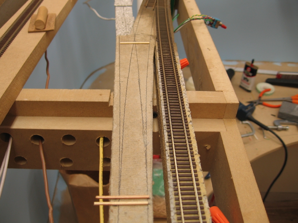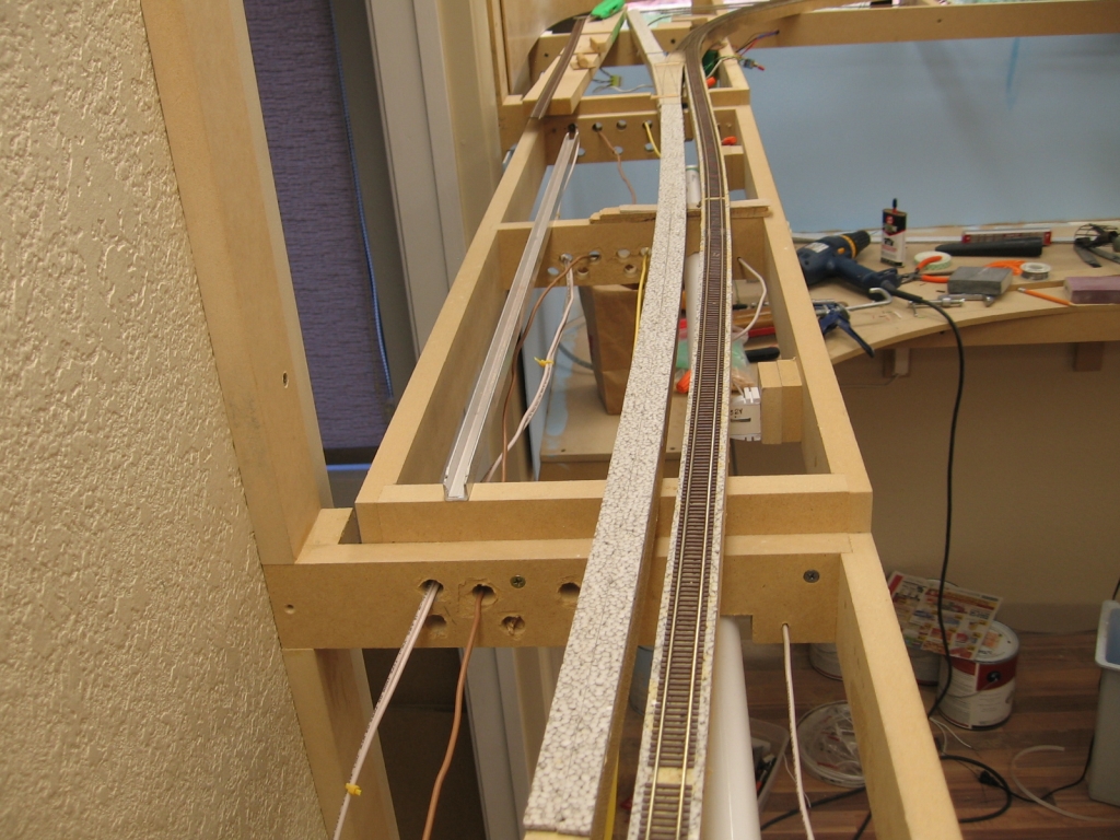 Progress has been moving, although there isn't much to take pictures of. Most of it has been wiring. 12v, 5v, DCC bus and loconet, detection, and switch machine dispatch control. I did manage to lay the wye turnout and trackage for the helper pocket.