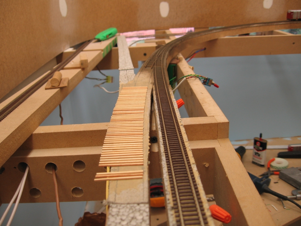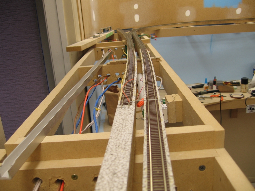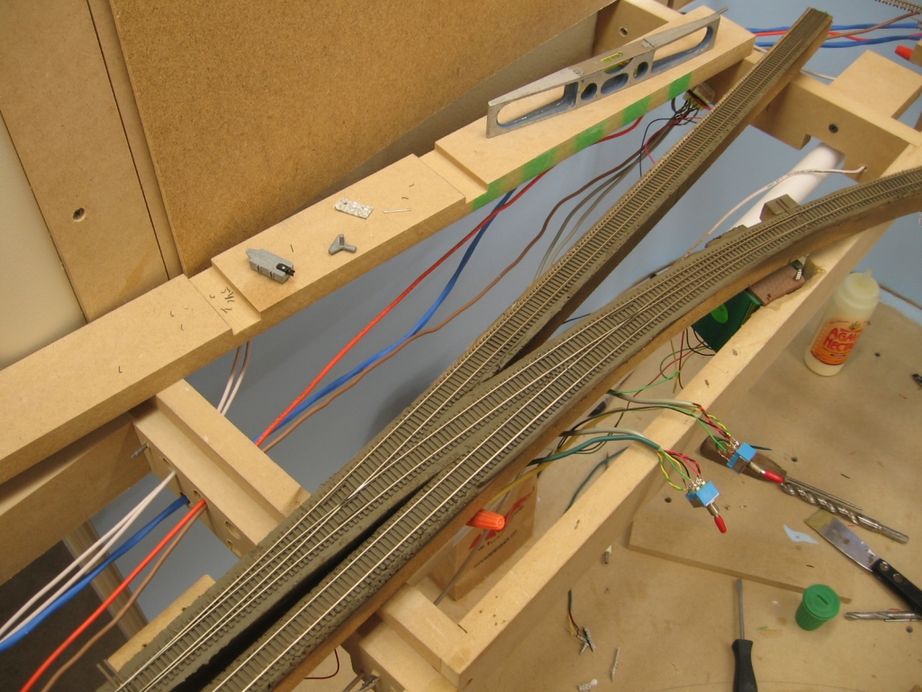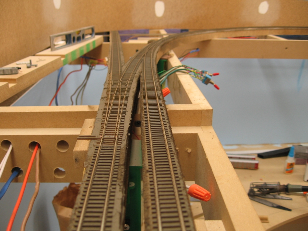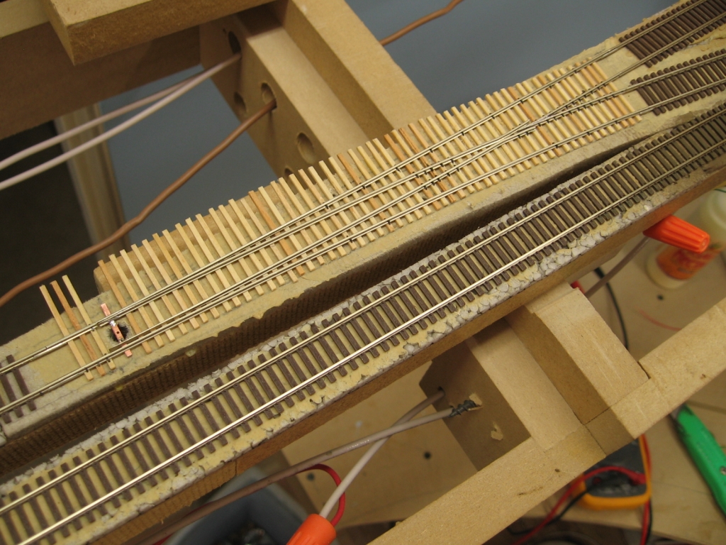 Ties glued down. Note the toggle switch for the main line turnout all wired up.