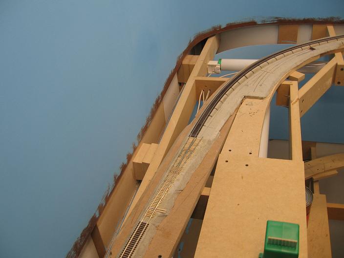 Another shot. You can see my desk lamp and the other battery powered light I was using to illuminate the benchwork for the hand laid turnout. Now I don't need these, since it's quite bright now.