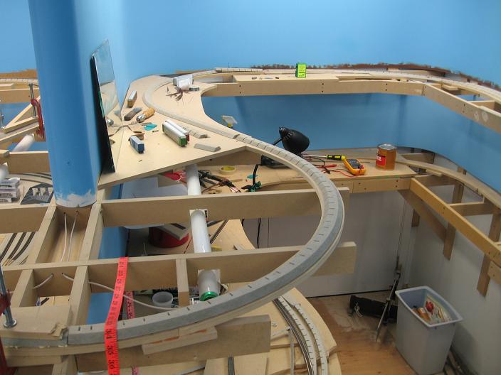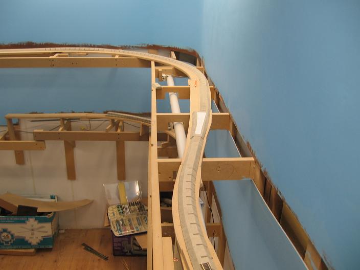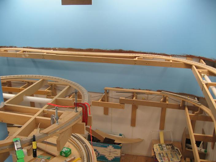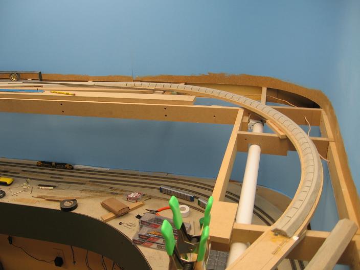 I've also put in place all the upper level main line roadbed and glued down most of it. Just have two more pieces to glue down. Those will be taken care of this next week. And like I normally do, once I get some roadbed glued down, I have to put the track down also. Up to tonight, I have the track in place from the north end of June Lake siding to half way around the peninsula. I only have about 25 more feet of track to put down and the entire upper level main line will be done. I can't wait to run a train across the complete upper level!