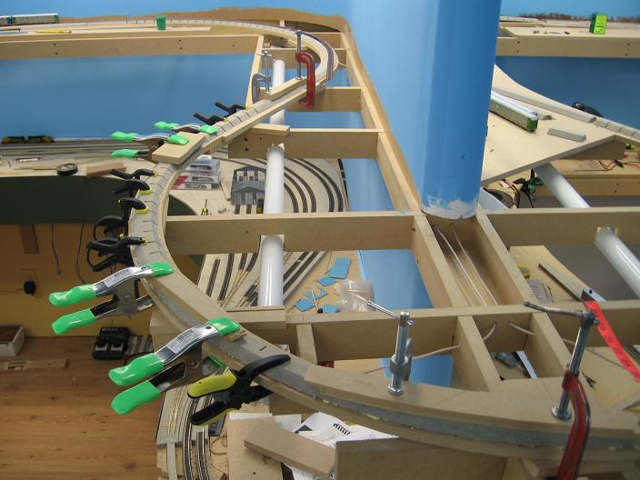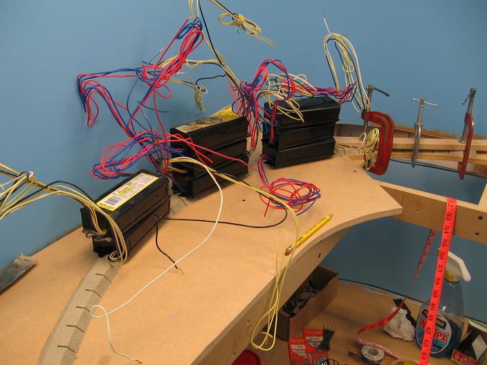 The old magnetic ballasts that came out of my recent light swap are used as weights to hold down the roadbed.