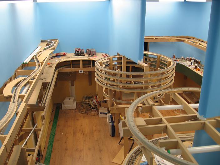Here is a from-the-ceiling shot of most of the train room. Yep, it's a mess.