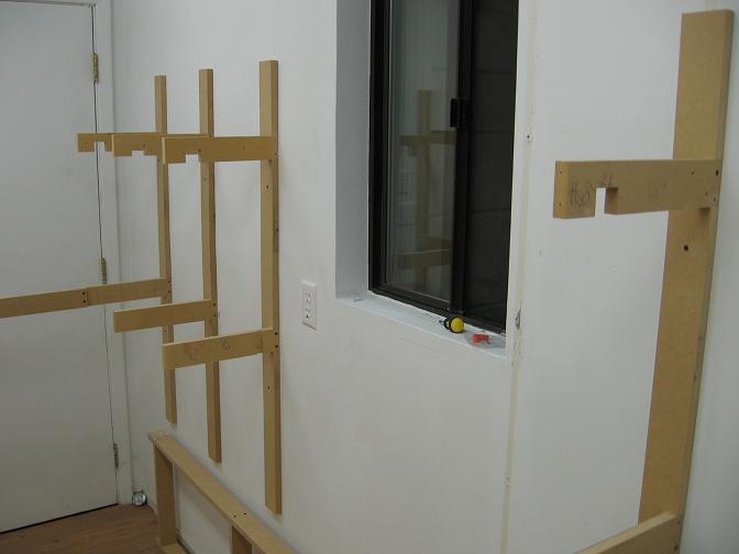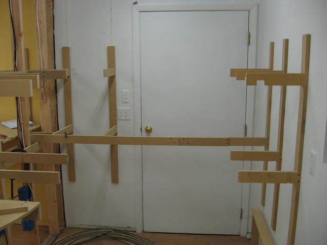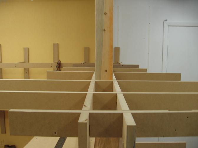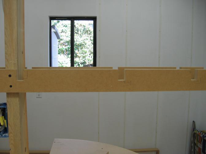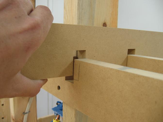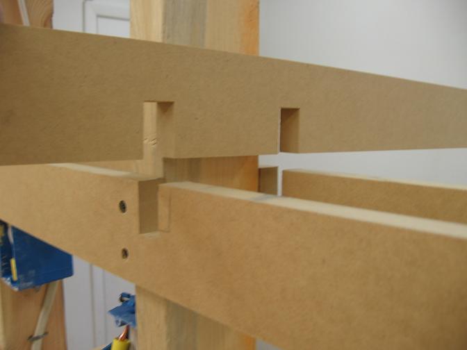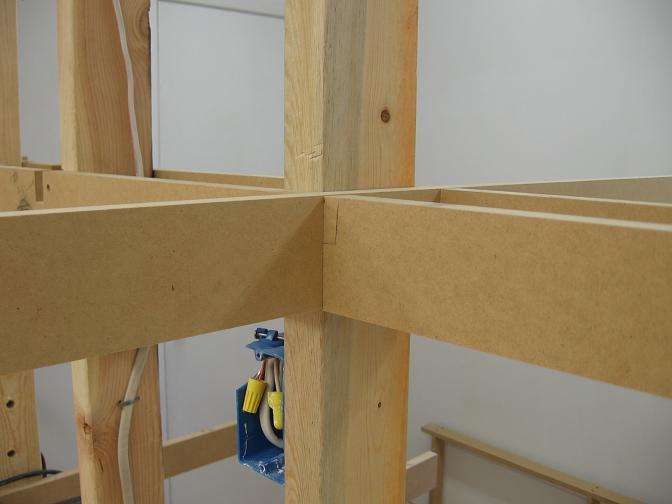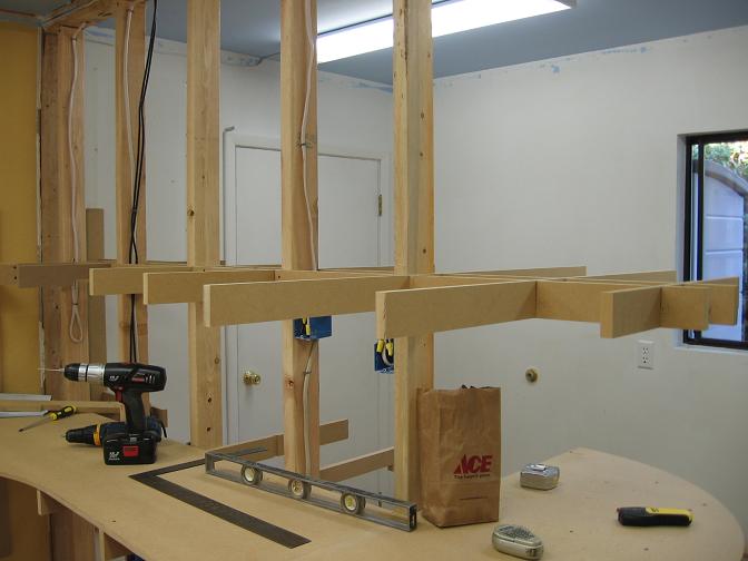 I started getting the upper level supports in on the peninsula this week. To keep the thickness of the supports as minimal as possible and still retain a good amout of strenght was not that difficult to do. I cut a dado half way into the support pieces and the same size dado into the cross members. Once lined up, they drop right into place, keeping the upper level even.