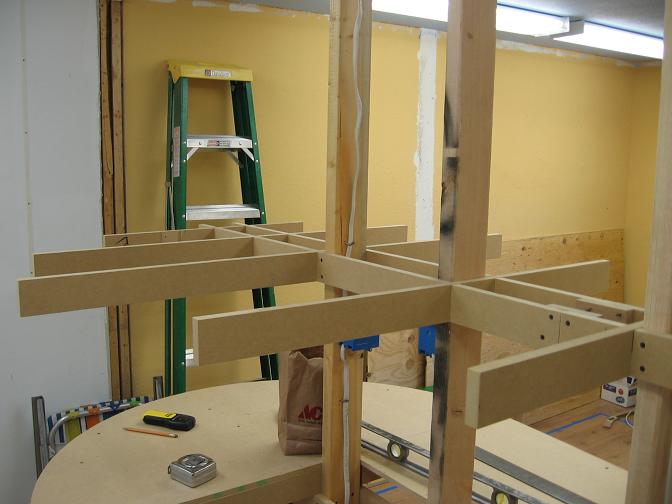 Benchwork also continued around the wall and in front of the door that used to be the entrance to the storage room. Getting the benchwork supported without screwing into the door was challenging, but it turned out great and it's pretty strong.