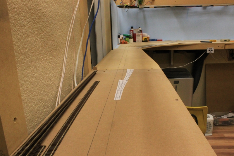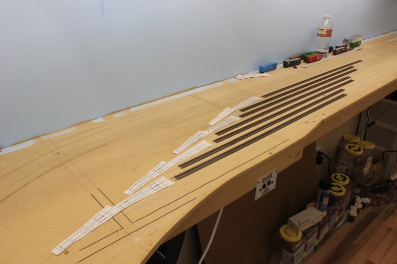 The start of the yard! Ties for the A/D tracks, all #8 turnouts.