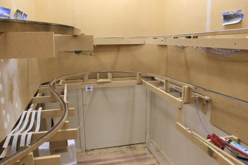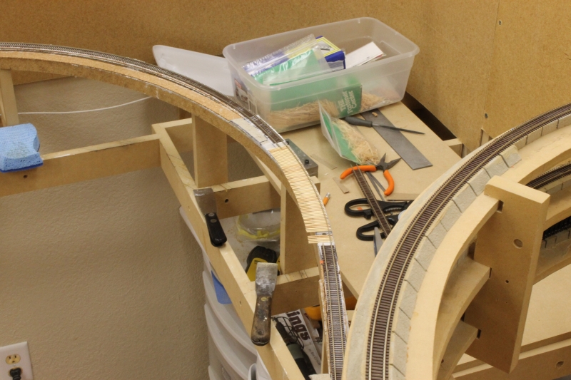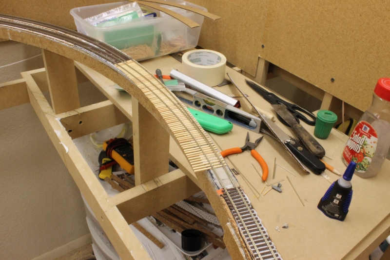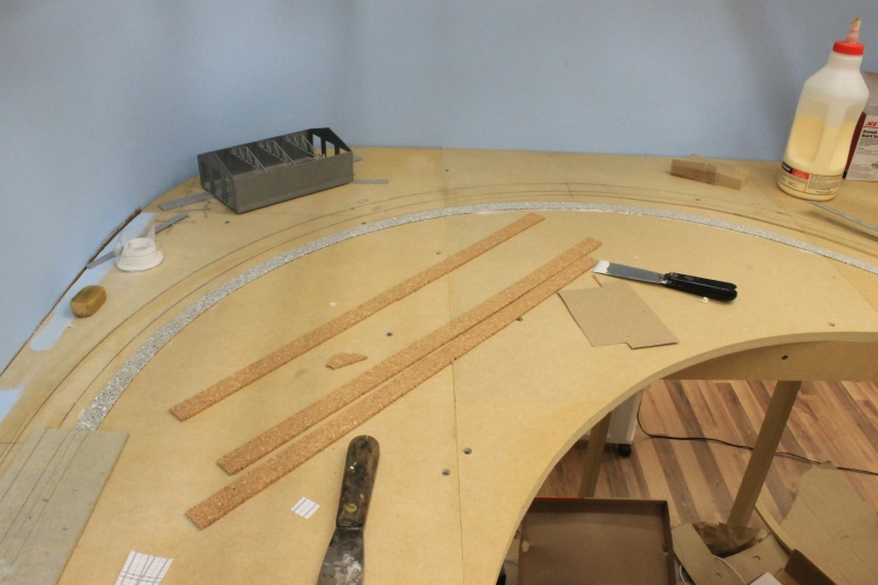 Gluing down the roadbed for the siding at Mammoth. The helix is just to the right.