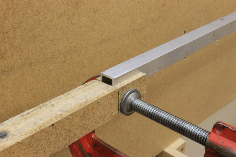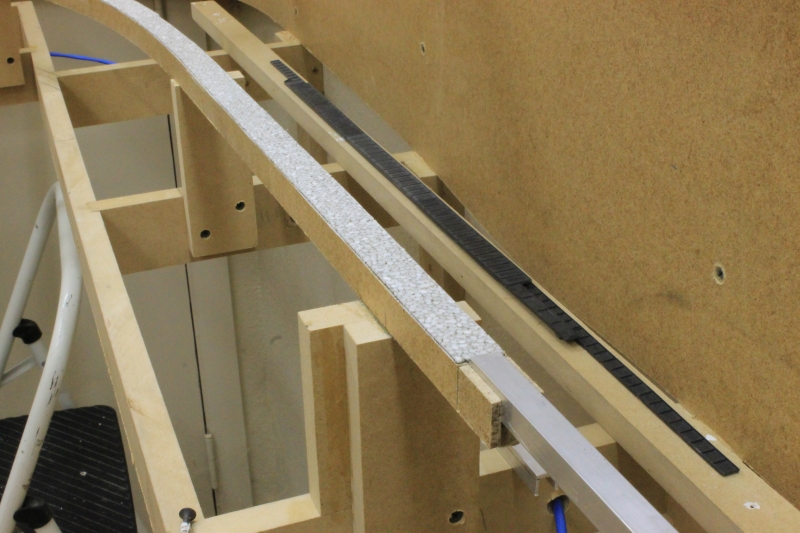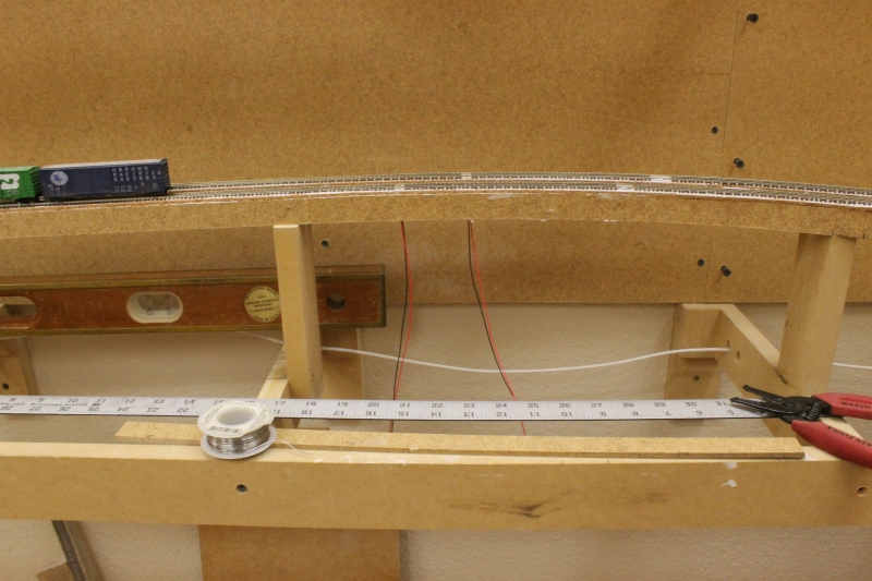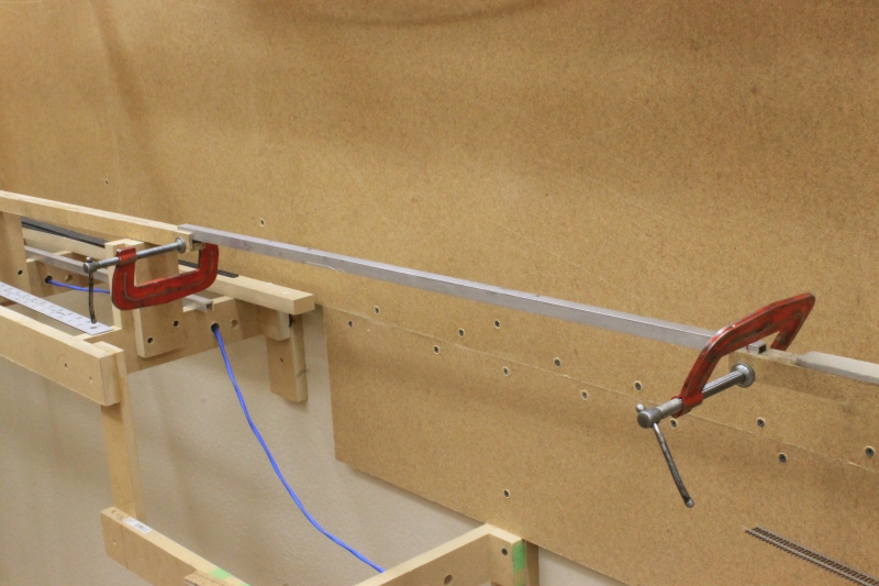 Close up. The aluminum bar sits on a support which holds it at the height of the roadbed. The outside pieces of masonite keep it centered.