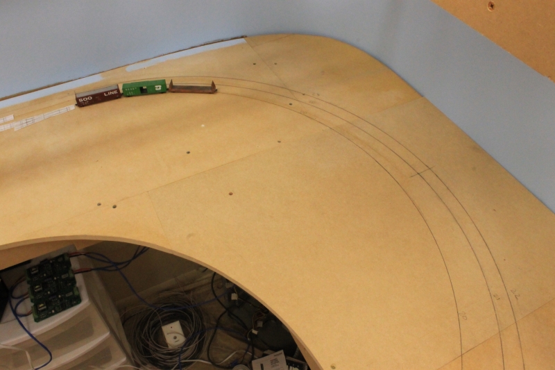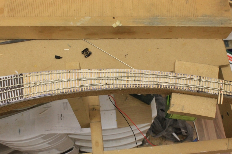 Here is the (almost) completed curved turnout at the north end of Mammoth. This thing gave me fits the whole time, but I finally got it to work great with my single axle Frontrunner flat cars. Inside curve is a 23" radius, outside curve is around a 24" with the easement starting about where the supports for the tortoise are.