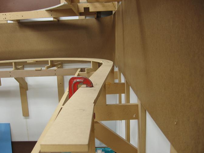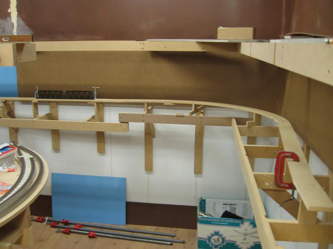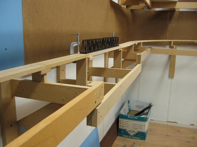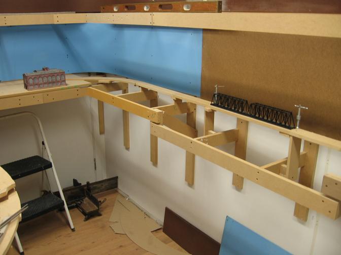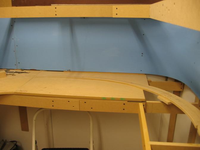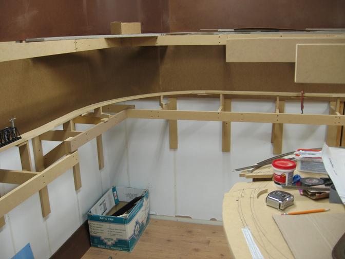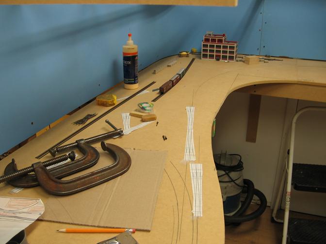 Here is the future North Bishop industrial area. This is where the tracks will drop down to a single main line. You can see the curve drawn on the MDF just in front of the building in the background.