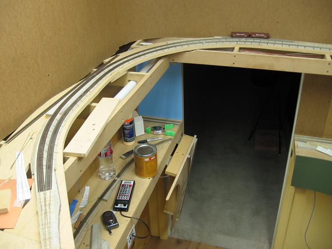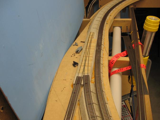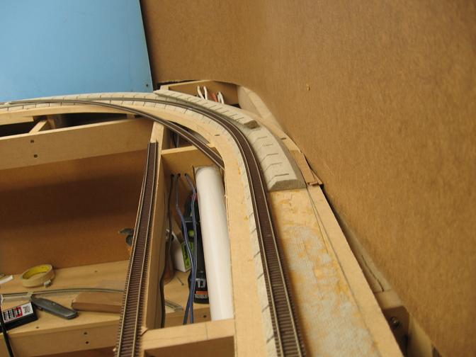 Just up around the corner was the only other space I had for a turnout. The track has to fit between the main line and the backdrop. It's gonna be a tight squeeze!