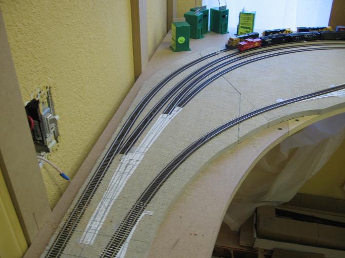 Back over in the yard, the main line is glued down and the turnout templates for the arrival/departure tracks are taped down. The yard lead for this side of the yard is in front.