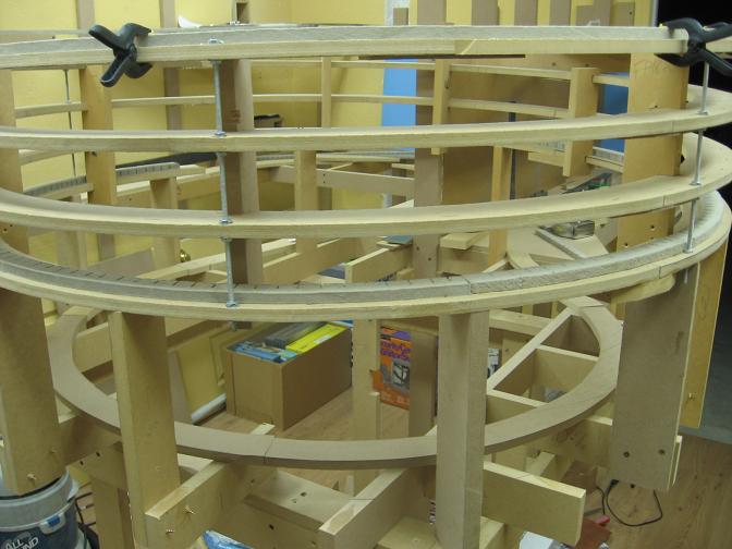 Here is an over view of the helix, which I had started gluing down the homasote strips for the track. The Tonopah staging tracks are located on the opposite side of South Bishop.