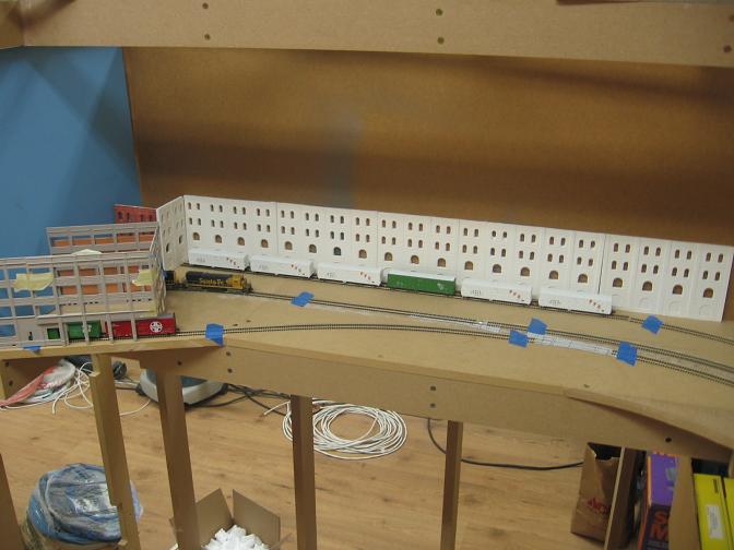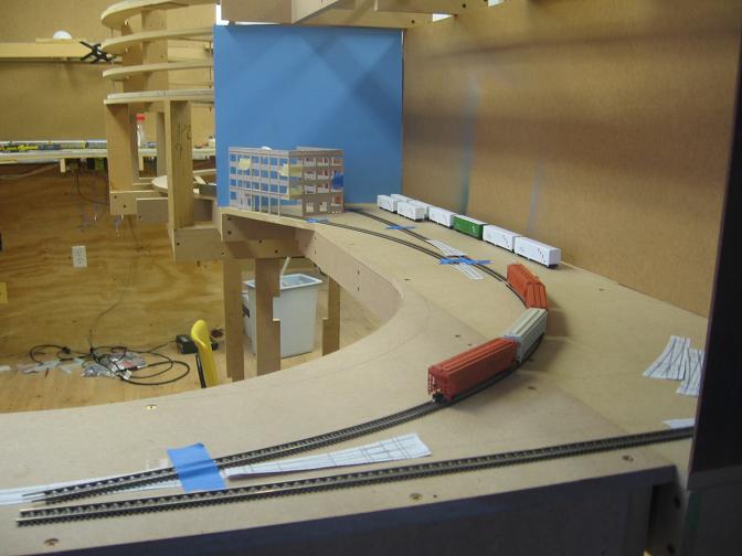 This picture was taken at my standing height (5'11") so the building does a good job of blocking the view of the branch line, which is the top track, from going thru the backdrop.