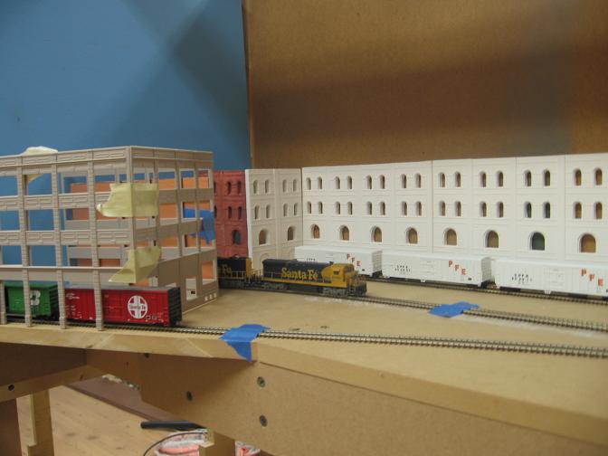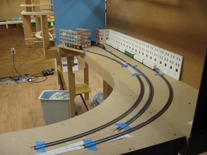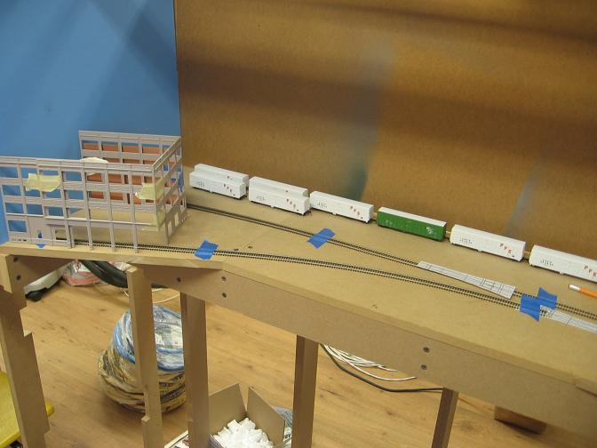Here I have started the mockup of South Bishop. The main line is in the front, and the hoppers are sitting on the branch line that goes to Tonopah (staging).