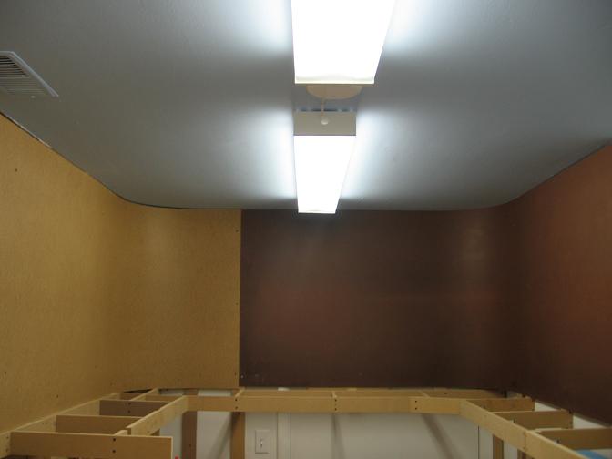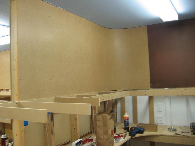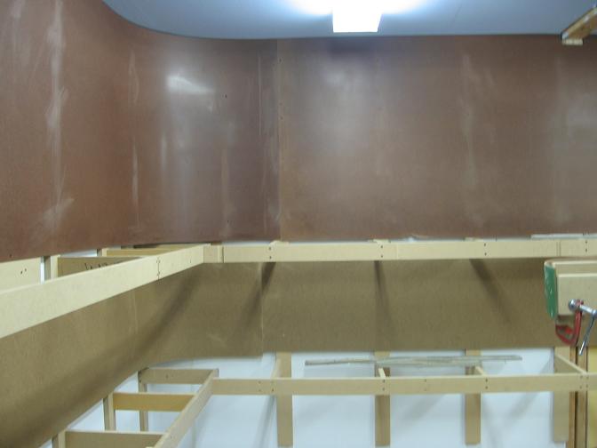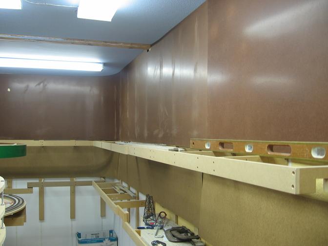 After doing some trackwork, I switched gears and started on the backdrops. The backdrops are 1/8" masonite hardboard. The pieces I had previously were of the non tempered style, and as my bad luck would have it, when I went to get the rest of the sheets I needed to complete the backdrops, all that Home Depot had was tempered. So that is why there is some color variation to the sheets in these pictures. I hope the tempered will hold the paint as well as the non tempered. We'll see. Anyhow, I like the look of curved backdrops, so I added in curves in each corner. I have found thru trial and error that the most I can bend these big sheets of wood down to is a 12" radius. So each corner is curved to around that measurement. It's quite a pain to push on the sheet while trying to drill a hole for a screw to go into while keeping the sheet level with the benchwork. All that is left now to do is go back and apply some wood filler to all the screw holes and uneven joints and sand them down smooth. I hate painting of any kind, so it will be a while till these get painted, I'm sure.