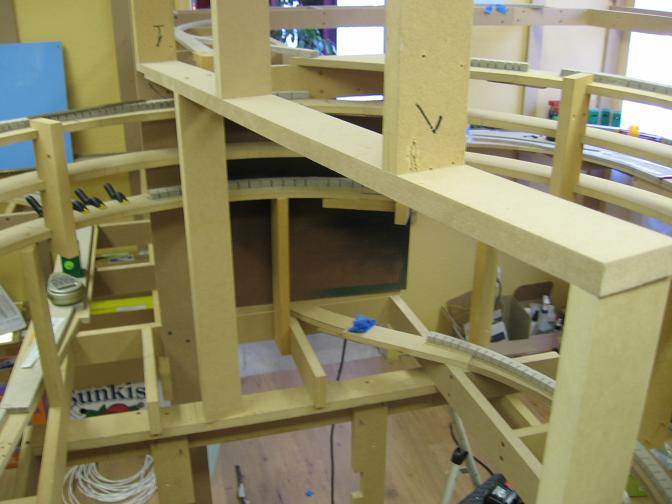 I also got around to finishing the backdrop supports for the helix area. With this in, you won't be able to see from one side of the helix to the other, which makes the main line seem further than it is.