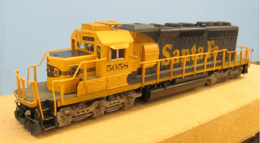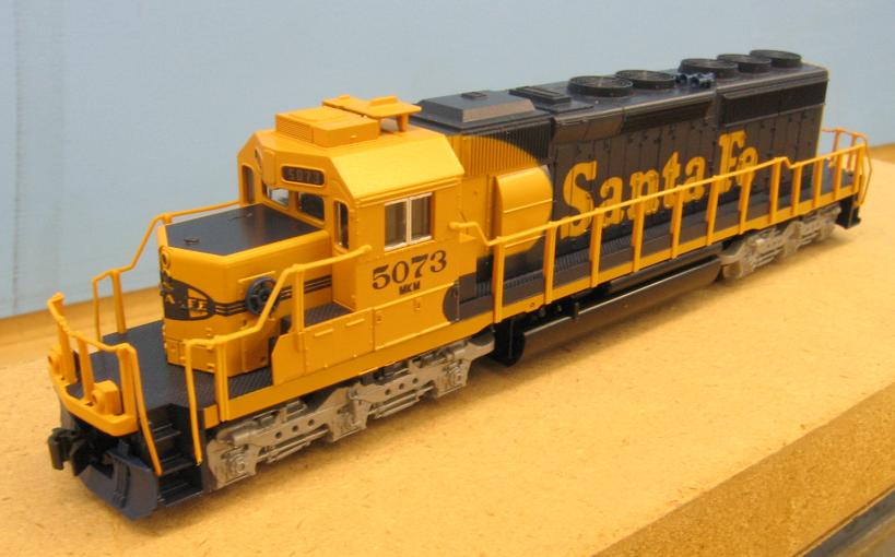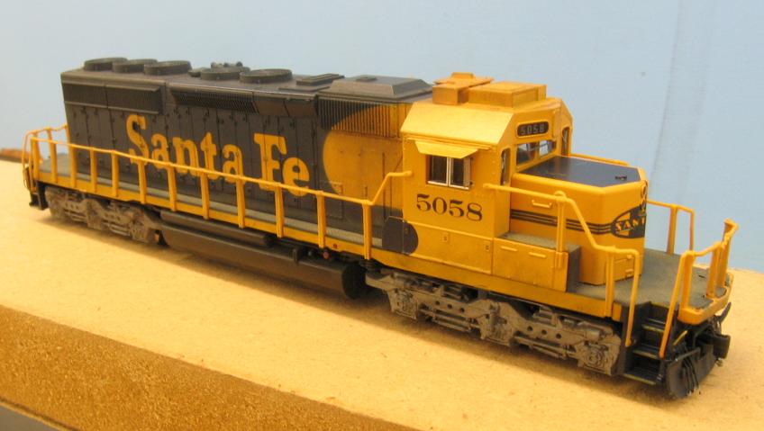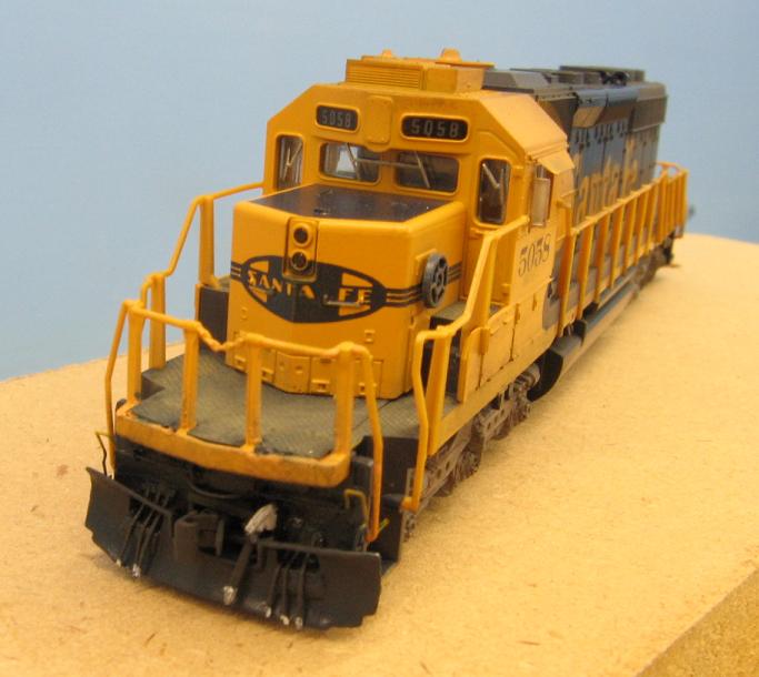 Here we have a newer Kato "mid production" SD40-2. I found a few pictures on the internet to work from for this loco. They label it a "mid production" as it comes with ditch lights and the "MKM" stencil on the side, meaning it's been maintained by Morrison Knudsen, which started in the mid 90's. Well, my modeling time is spring 1988, so I needed to backdate this loco. First thing to do was "ditch" the ditch lights! I cut them off and filed them down even with the anticlimber. I then added some BLMA brass walkway to cover the holes that were left. There was a small lip left from where the brass met the stock plastic walkway, about as noticeable as the stock split in the walkways. But once painted and weathered, it was hard to see the line between the walkways and the brass add-on's. Next was to erase that little "MKM" on each side under the numbers. Once done, I added some sun shades, rear view mirrors and windshield wippers to the cab. Kato did a pretty good job of including a stock air conditioner, antenna stands and antenna. On down to the pilots, I got rid of the stock all in one snow plow/MU hoses and added a new plow and MU hoses. I also added some cut levers and air hoses. Next was some yellow paint on the step ends, a better matching blue horn, and red on the fuel filler lids. Two Z scale couplers and some weathering with chalks rounded out the shell. MRC makes a DCC sound decoder for this loco, so that was added next. The light in the front was not as bright as I wanted, so I took and swaped it out with the light from the stock light board, as this turned out to be much brighter. Once the sounds were programmed and the loco was speed matched, I added it to the fleet. Needless to say, this loco is always at the front of a consist! =)