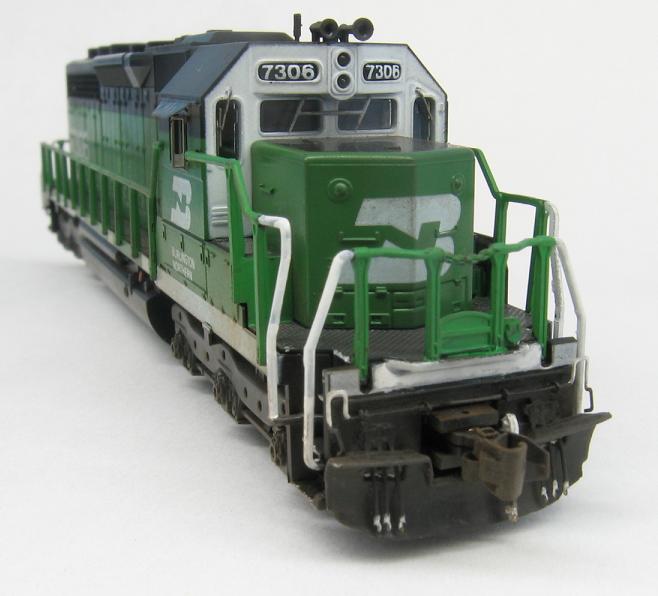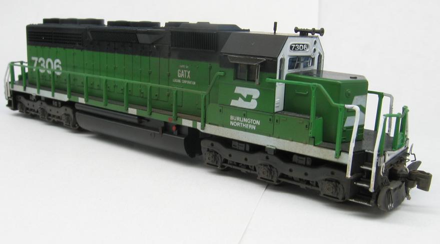 I found a few pictures to work from on the 'net of these rebuilt SD40's. They were rebuilt in 89' and leased back to the BN by GATX leasing. First thing to do was paint the handrails green and the ends white. I then added cut levers, air hoses, MU hoses and a plow up front. On the cab, I added wind deflectors/rear view mirrors, windshield wipers, sunshades and a firecracker antenna. I also added numbers to all the numberboards. I did leave off one of the major details of these rebuilds - the brake wheel and stand on the rear platform. Since this involve making one out of scratch and filling in the ratchet brake on the nose, I skipped this untill my skills improve. I also left the Micro Trains N scale couplers on this loco. Once the shell was done, I added a TCS CN-GP decoder to the frame with minimal milling involved. I also gave the shell just a light weathering job. Another smooth running loco is ready for pool service on the OVS!