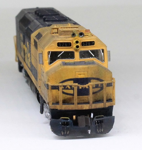 After all that, I covered up the nose lights and added an NSN headlight casting to the cab, drilled it out and filled it in with Microscale Kristal Klear for operating headlights. Touch up paint, grab irons on top of the nose and a new Microscale ATSF nose decal finished up the front. I did goof up and forget to add the grabs on the front of the nose when everything was apart, but after taking the loco apart so many times to test fit everything, the front handrails were starting to get to the point where they were gonna break off. Maybe down the road I'll buy some more handrails from the Kato parts dept. and add the grabs. For now, this loco will never be a leader, but with it's long body, will look good mixed in a lash up.