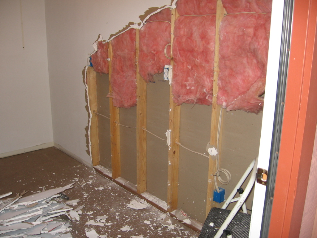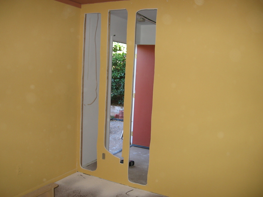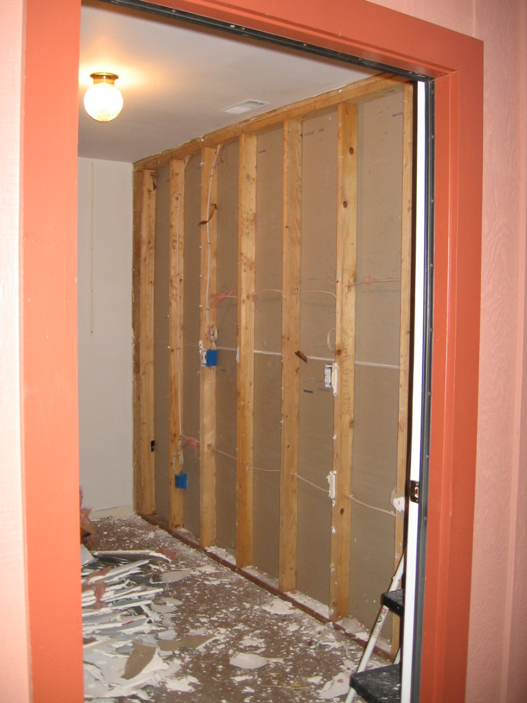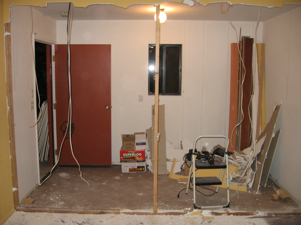 The wall is outta here! Though this wall was not a load bearing wall, I felt a little uneasy about taking out all the supports, so untill the layout plans were finalized, I left it in place.