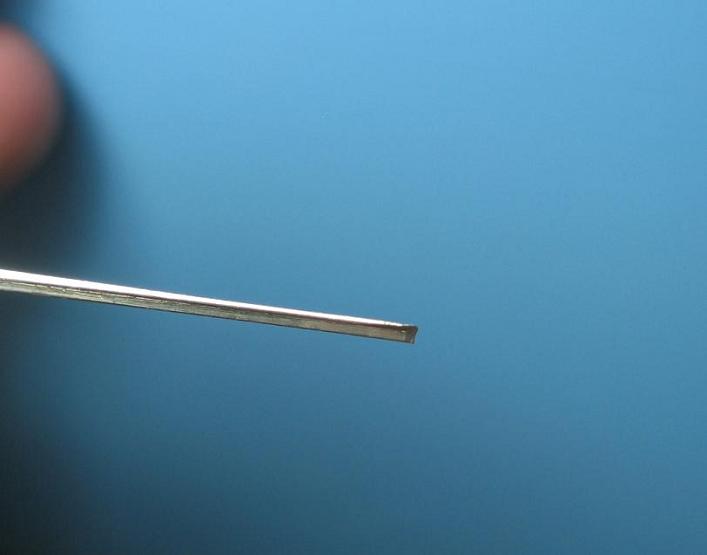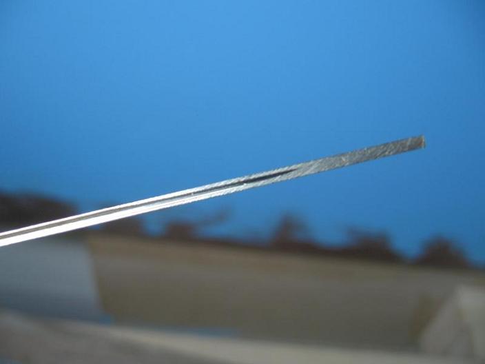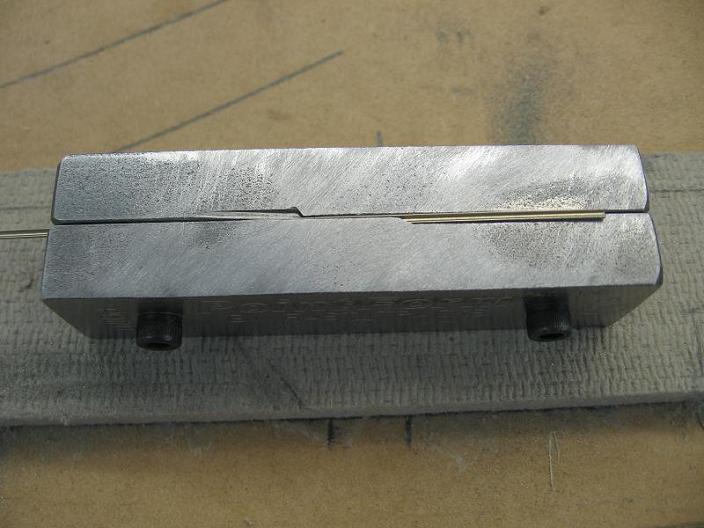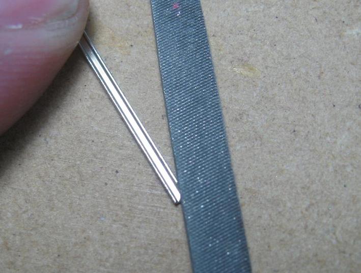 File the rail down, take it out and using the Xacto blade, run it back and fourth around the filed area to get rid of any burrs on the rail. Again, run your fingers around the filed are to make sure it's nice and smooth. You might also have to straighten the rail back out some since the point former tends to put a slight bend in it.