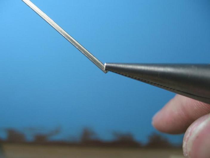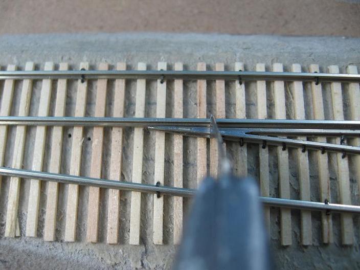 After the head is filed down, I take the pliers and put a slight bend in the area that was just filed down. This assures that the point will make contact in the notched out area of the stock rail.